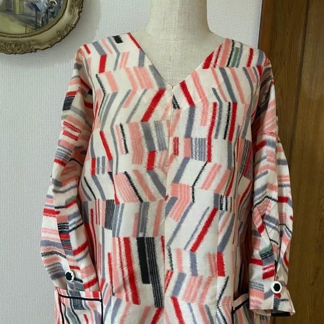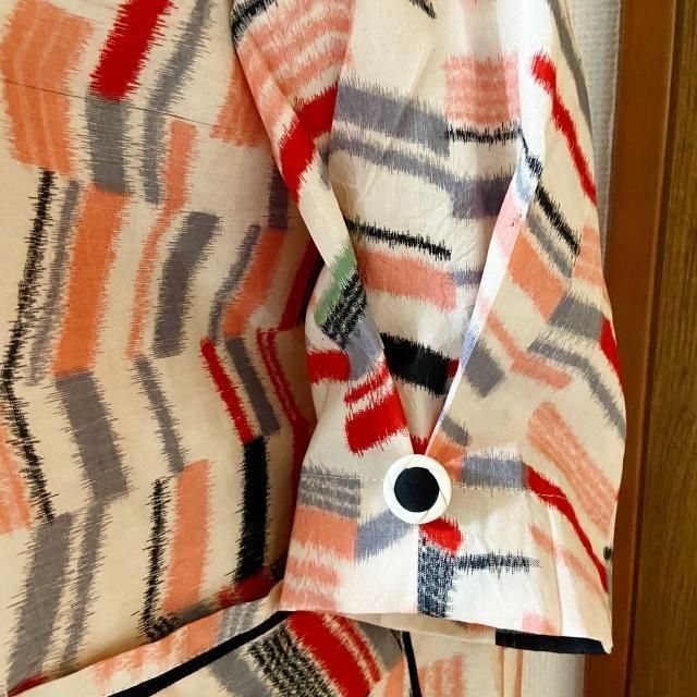 柄の中の黒をパイピングやボタンに生かしました。歯切れの良いキリッとしたテイストのチュニックです。パンツにふわっと着るだけでオシャレなチュニックです。アクセサリーや小物の演出も無くても十分に主張してくれます。