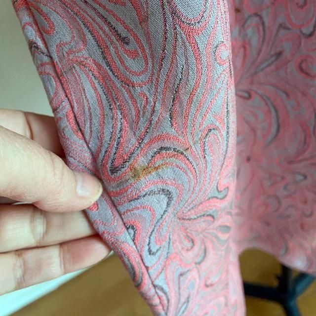 古い人絹のため洗いジワがたくさん残りました。また、できる限り避けたのですが茶色いシミが残っています。(後左裾より)